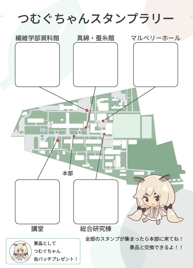 スタンプラリーを行います!! 2025.10.20 「みんなに繊維学部のことをもっとよく知ってほしいっ!!」 ということでみんなに協力してもらって繊維学部を紹介できるスタンプラリーを作ってもらったよ!つむも頑張ってポイントのところを紹介するから見ていってね (⋈◍>◡<◍)。✧♡ 委員会の人に景品も用意してもらったんだっ💕